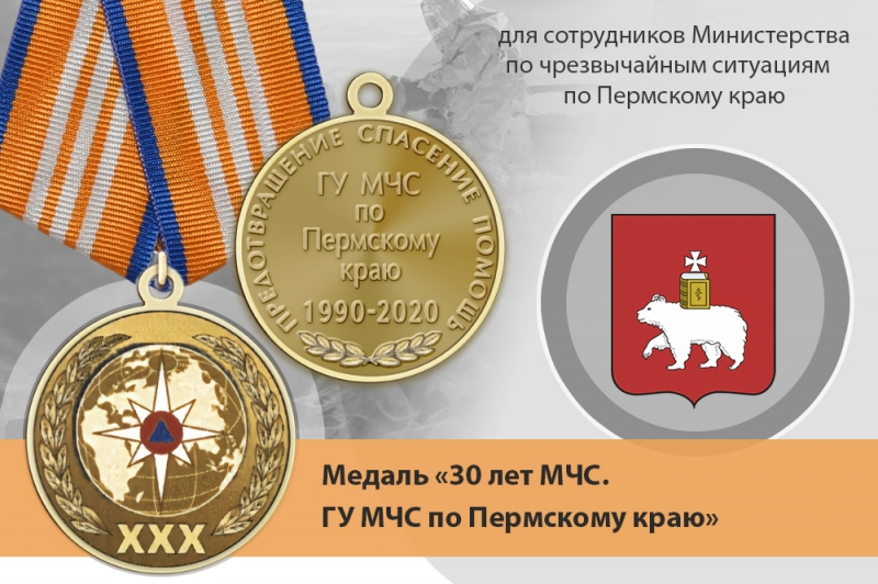 Медалью «30 лет МЧС России» награждается личный состав ГУ МЧС России по Пермскому краю, а также другие граждане за заслуги в деле создания, развития и обеспечения успешного функционирования ведомства. В комплект входит бланк удостоверения. Медаль может быть поставлена с колодкой "Ветеран".