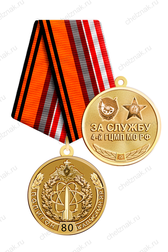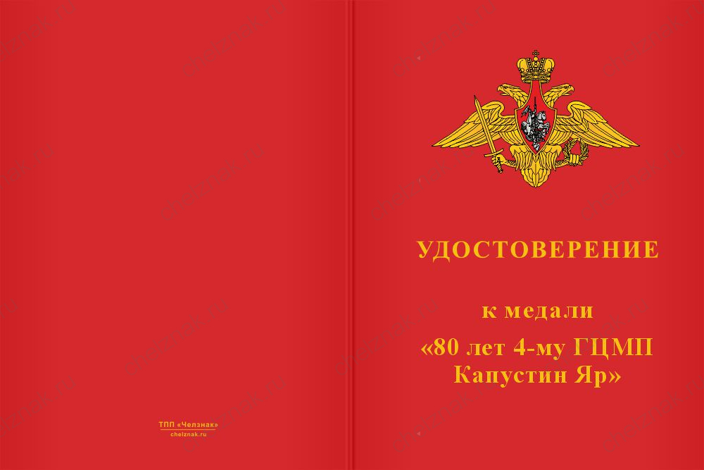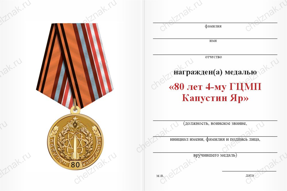 Медаль «80 лет 4-му ГЦМП Капустин Яр» с бланком удостоверения арт. 34189