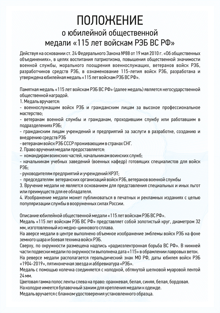 День празднования юбилея данного подразделения приходится на пятнадцатое апреля, и к этому событию приурочена торжественная награда, позволяющая отметить заслуги ветеранов и поощрить сотрудников. Награда не относится к государственным, но это не делает её вручение менее важным мероприятием. Поэтому если вы хотите выразить благодарность специалистам РЭБ, купить такую медаль по доступной цене вы сможете на нашем сайте.