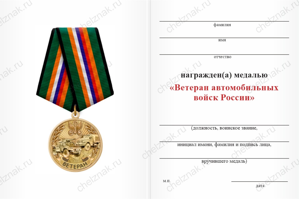 Медаль «Ветеран автомобильных войск России» с бланком удостоверения арт. 21922