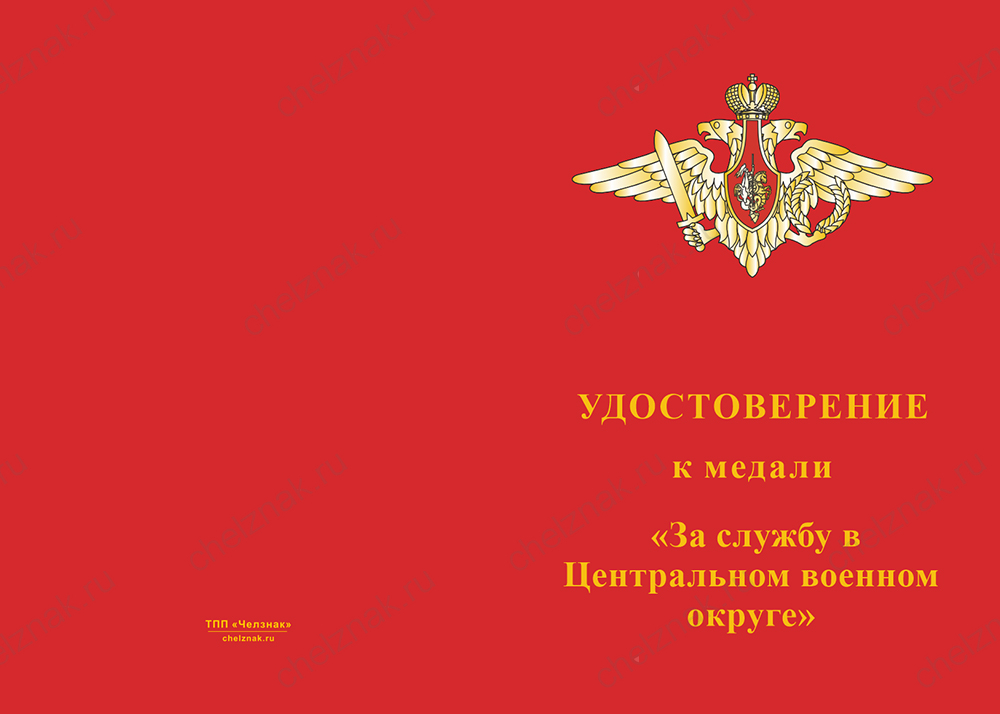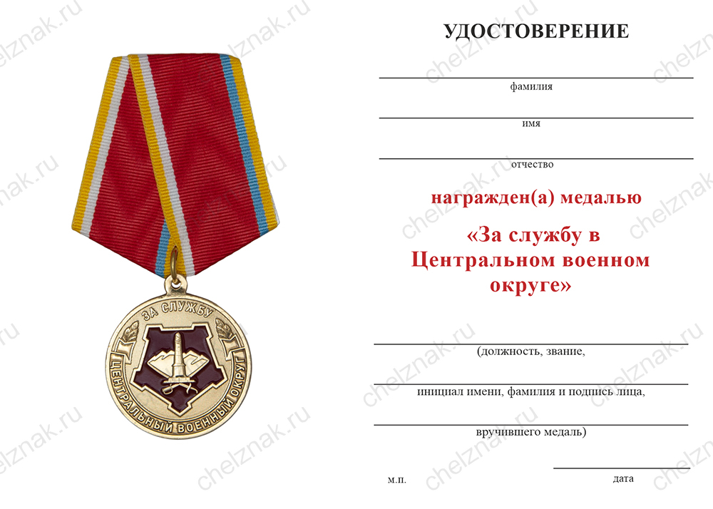 Медаль «За службу в Центральном военном округе» с бланком удостоверения арт. 36141