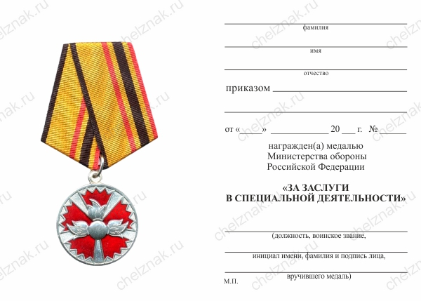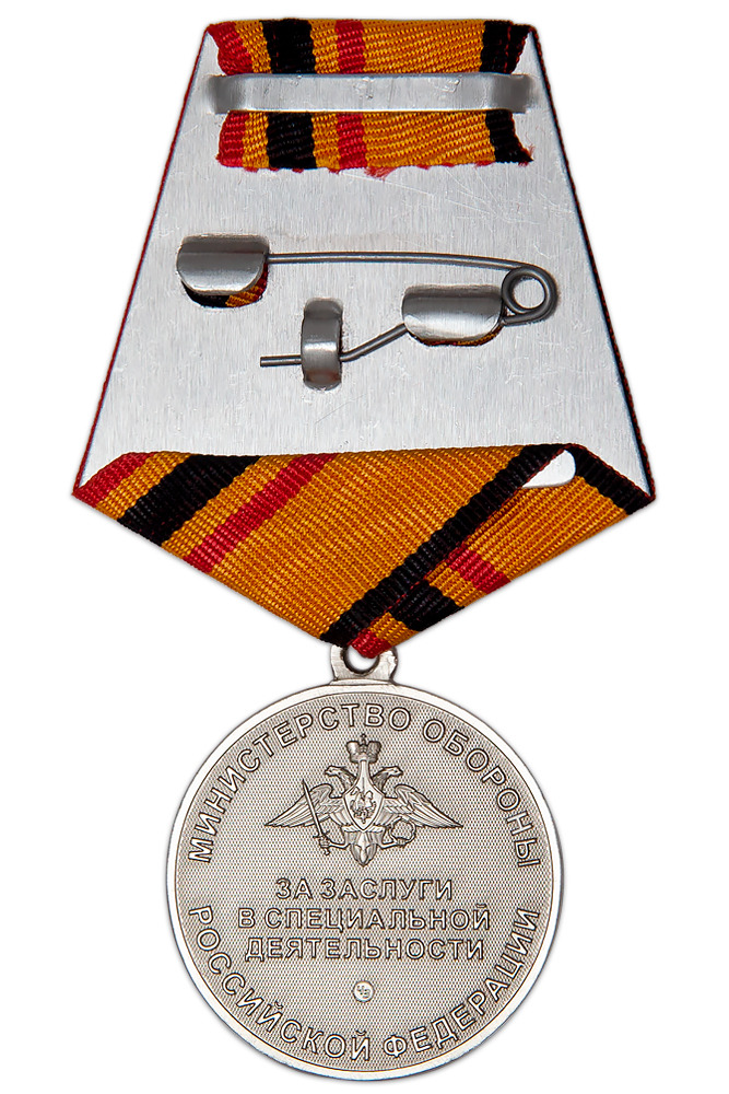 Медаль Министерства обороны России «За заслуги в специальной деятельности» изготовлена из нейзильбера. Круглая, диаметр 32 мм, с ушком и разъёмным кольцом для подвеса. В комплекте — бланк удостоверения установленного образца.