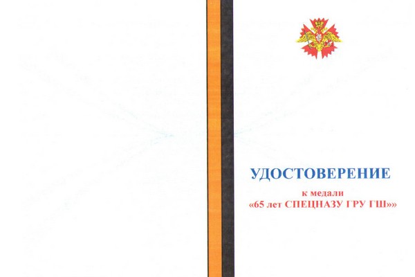 Знак «65 лет спецназу ГРУ ГШ ВС РФ» с бланком удостоверения арт. 9761