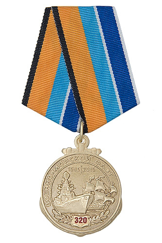 30 октября в Российской Федерации отмечается День основания Российского военно-морского флота. В честь этого выдающегося события была введена новая юбилейная медаль «320 лет ВМФ», предназначенная для поощрения военных моряков. Награда круглая, чеканится из латуни. Центральная деталь аверса — военный корабль, идущий по морским волнам. Рядом с ним, правее, находится парусный корабль времен Петра. Выше — даты существования ВМФ: «1696 2016». Они разделены вертикальной черточкой. Внизу две ветки дуба. Между которыми помещен свиток с надписью: «320 лет». По периметру, полукругом, выгравировано: «ВОЕННО-МОРСКОЙ ФЛОТ». Поверхность оборота гладкая. На ней в 3 ряда выгравированы слова: «МУЖЕСТВО ДОБЛЕСТЬ ОТВАГА». Ниже две горизонтальные черточки, между которыми небольшая 5-конечная звездочка. Лента, которой покрыта колодка, разделена на три части. Слева синяя полоса, справа оранжевая. Между ними — голубая. Слева — черный кант. Синяя полоска окаймлена белым кантом. Крепление происходит с помощью булавочного зажима. 30 октября 1696 года Боярская Дума по настоянию Петра I приняла решение о создании регулярного военно-морского флота России.