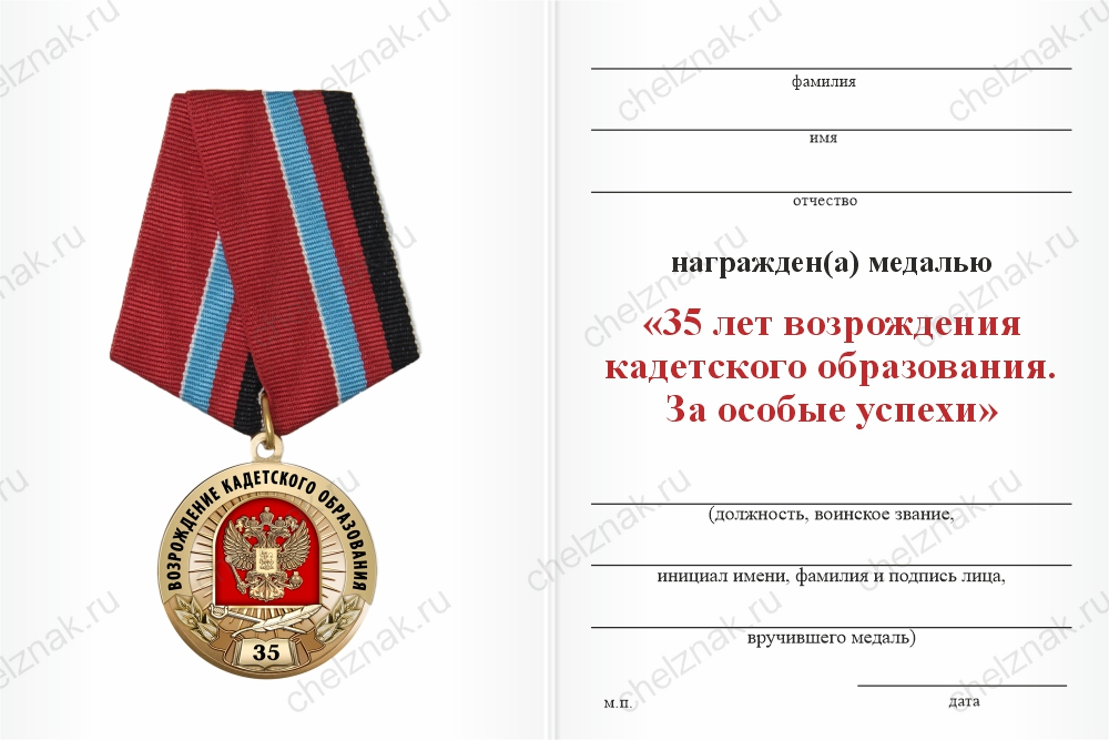 Медаль «35 лет возрождения кадетского образования. За особые успехи» с бланком удостоверения арт. 52021