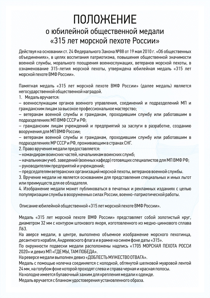 [16126] Фотогалерея Медаль «315 лет морской пехоте России» с бланком удостоверения, положение о награде 9