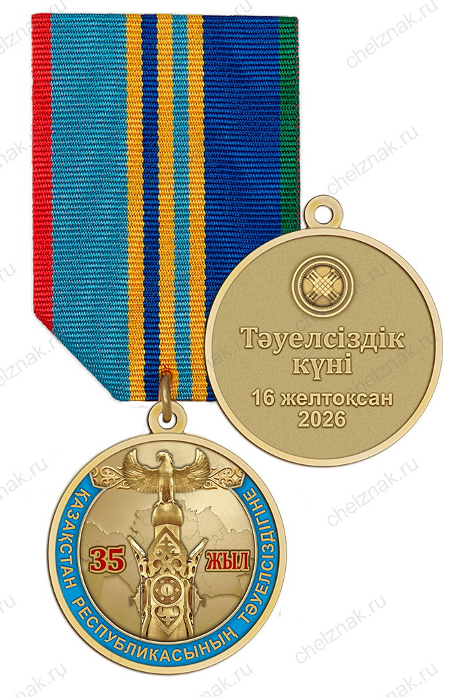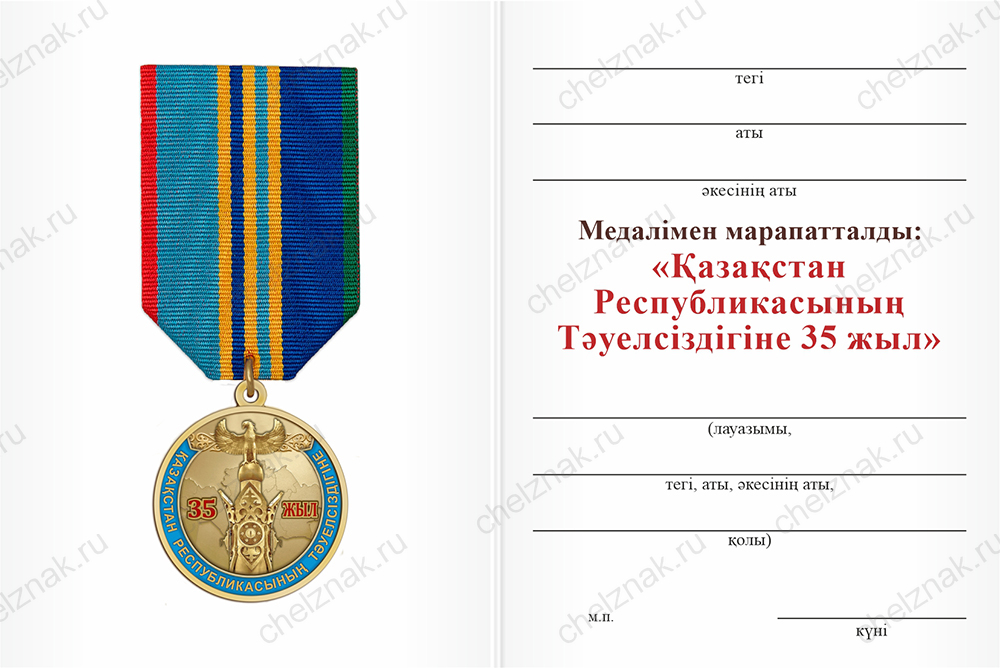 Медаль «35 лет независимости Казахстана» на 6-ти угольной колодке с бланком удостоверения арт. 21394