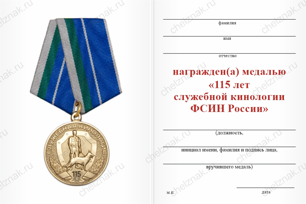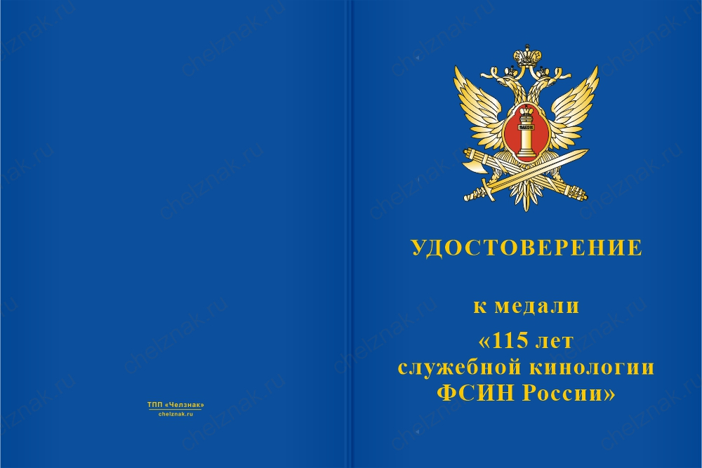 Медаль «115 лет служебной кинологии ФСИН России» с бланком удостоверения арт. 89405