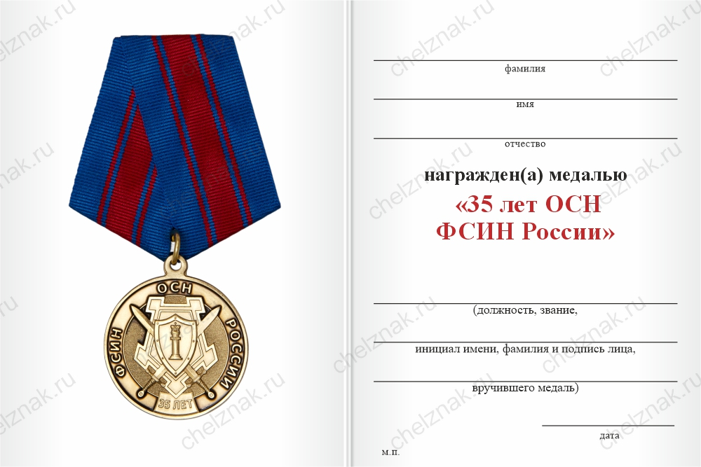 Медаль «35 лет ОСН ФСИН» с бланком удостоверения арт. 97642