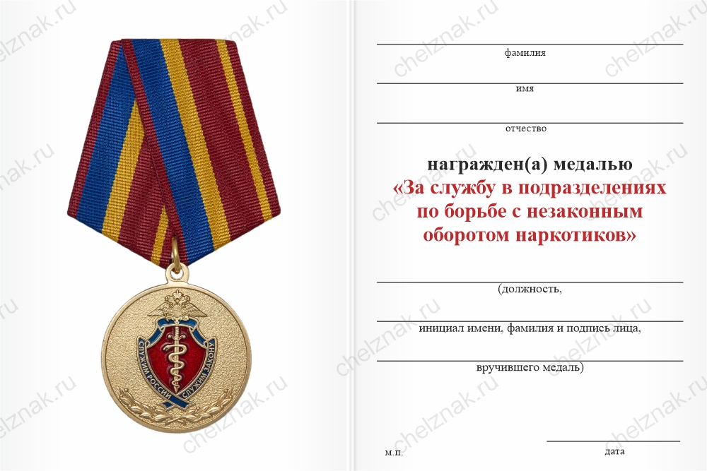 Медаль «За службу в подразделениях по борьбе с незаконным оборотом наркотиков» с бланком удостоверения арт. 34179