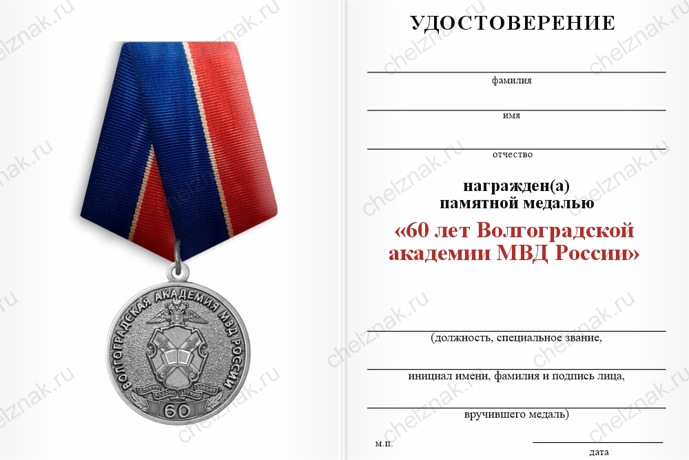 Медаль «60 лет Волгоградской академии МВД России» с бланком удостоверения арт. 128617