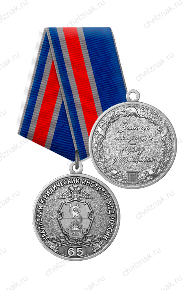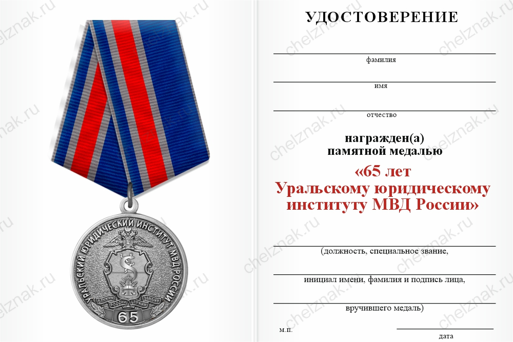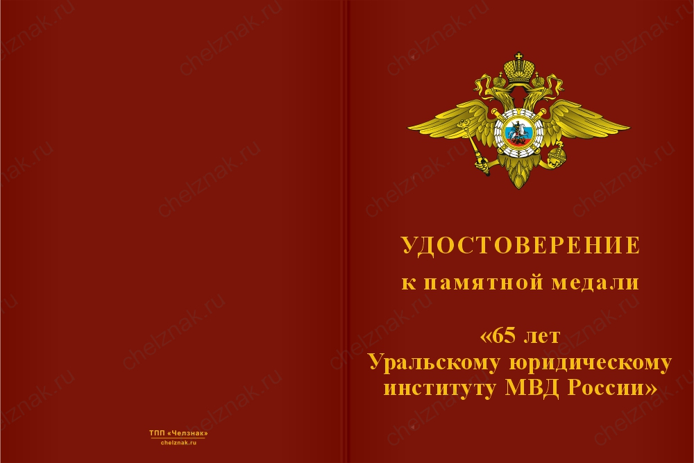 Медаль «65 лет Уральскому юридическому институту МВД России» с бланком удостоверения арт. 23048