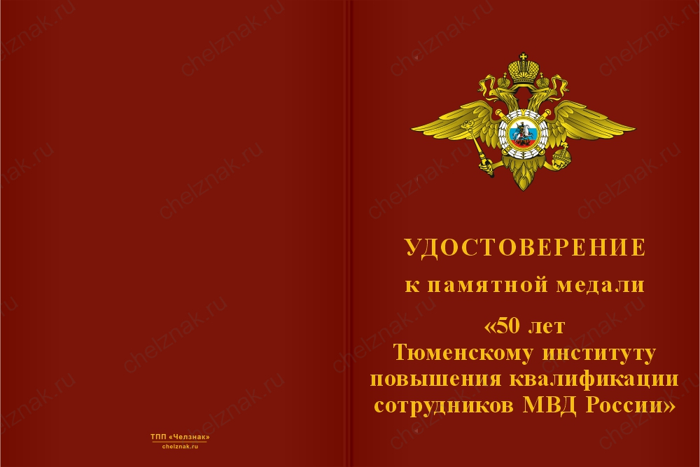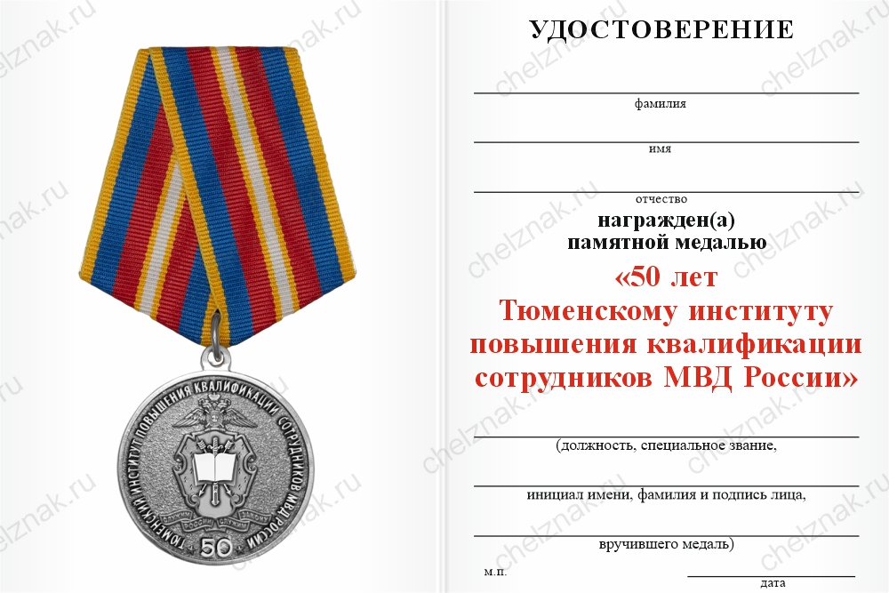 Медаль «50 лет Тюменскому институту повышения квалификации сотрудников МВД России» с бланком удостоверения арт. 83652