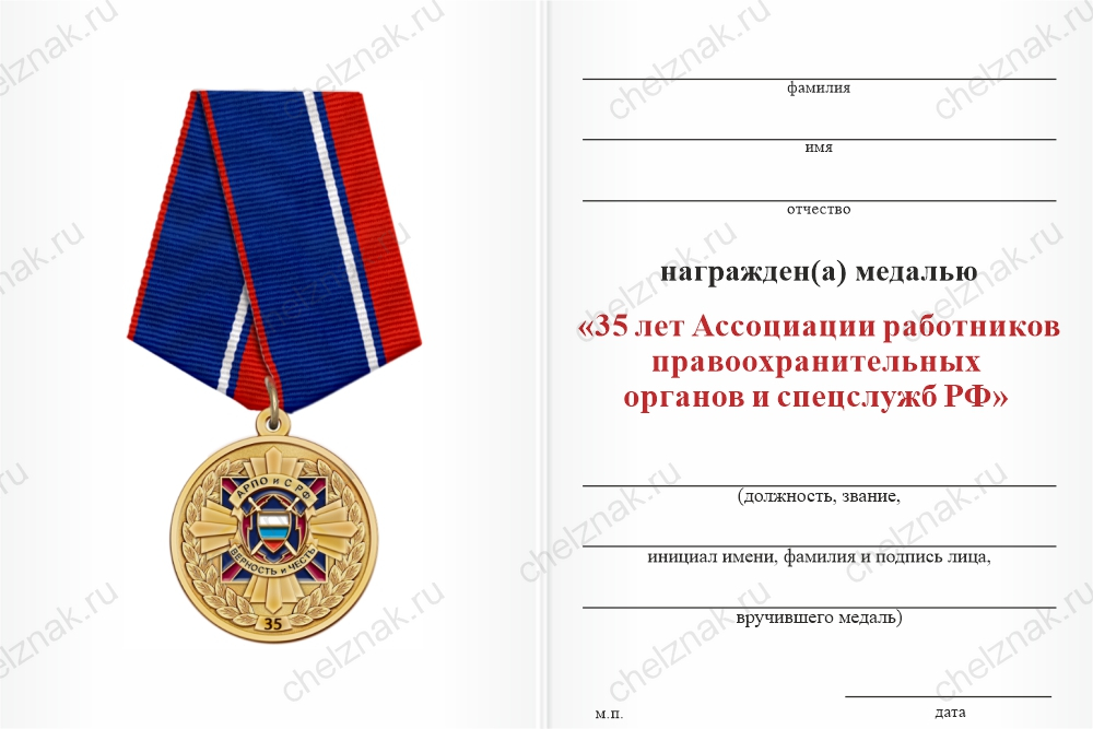 Медаль «35 лет АРПОиС РФ» с бланком удостоверения арт. 36137