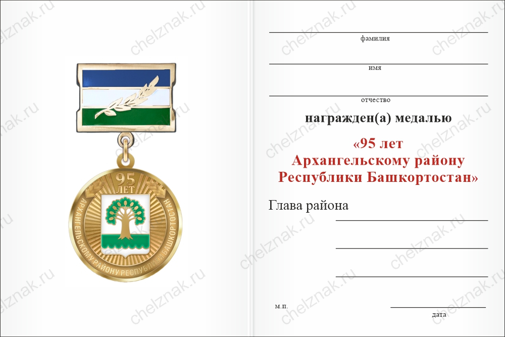 [95101] Фотогалерея Бланк оборотная сторона Медаль «95 лет Архангельскому району Республики Башкортостан. Почётный гражданин» с бланком удостоверения