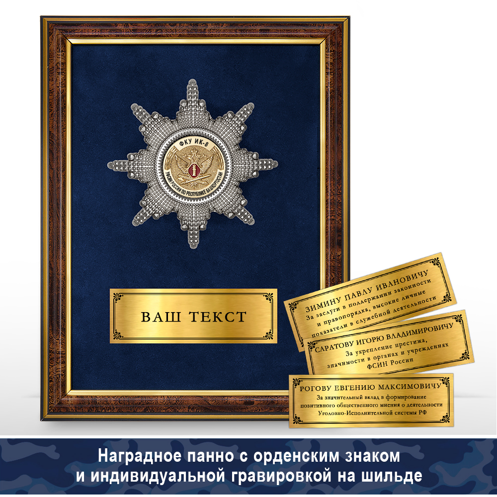 Вы можете заказать медали с индивидуальной надписью на аверсе предназначенную для награждения сотрудников и ветеранов ФКУ ИК-8 УФСИН России по Республике Башкортостан, а также гражданских лиц. Также изготовим юбилейные медали ко дню образования исправительного учреждения. Надписи выполнены с применением технологии лазерной гравировки. При необходимости, возможно изготовление по индивидуальному заказу.